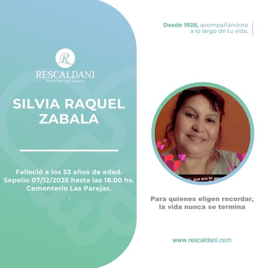 EN LAS PAREJAS: SILVIA RAQUEL ZABALA -Q.E.P.D.- 01/02/1972 + 07/12/2025 FALLECIÓ A LOS 53 AÑOS DE EDAD. Sepelio 07/12/2025 hasta las 18:00 hs. Empresa Rescaldani -LAS PAREJAS-