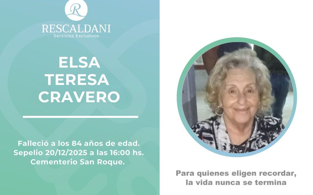 EN MARCOS JUAREZ:ELSA TERESA CRAVERO Q.E.P.D.-26/05/1941 + 19/12/2025A LOS 84 AÑOS DE EDADSus restos serán sepultados el día SABADO 20 a las 16.00 hs.En el cementerio San Roque.Empresa Rescaldani Marcos Juárez-Marcos Juarez-