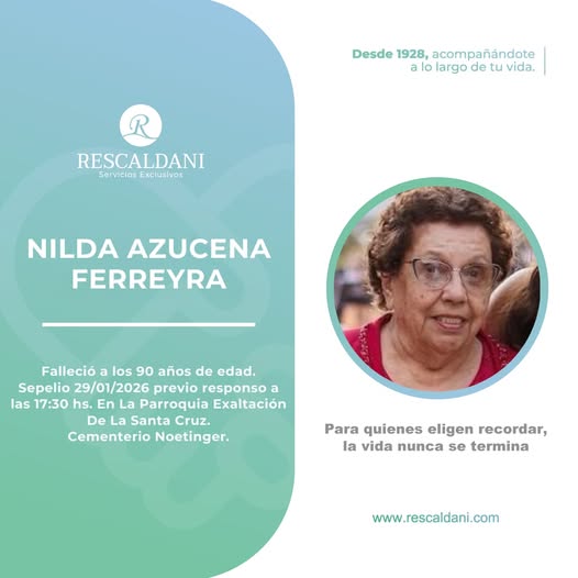 Sus restos serán sepultados el día JUEVES 29 del Cte. previo responso a las 17:30 hs en la Parroquia Exaltación De La Santa Cruz.